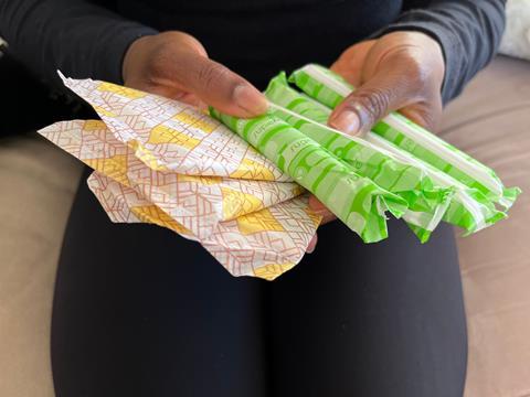 Conventionally, anywhere between eight and twenty-six wrapped pads are sold in one flexible polymer bag. Companies are increasingly embracing cardboard boxes and paper packets for external packaging – Paptic’s wood fibre-based material is a recent contribution to the trend – but these remain a minority on the market.